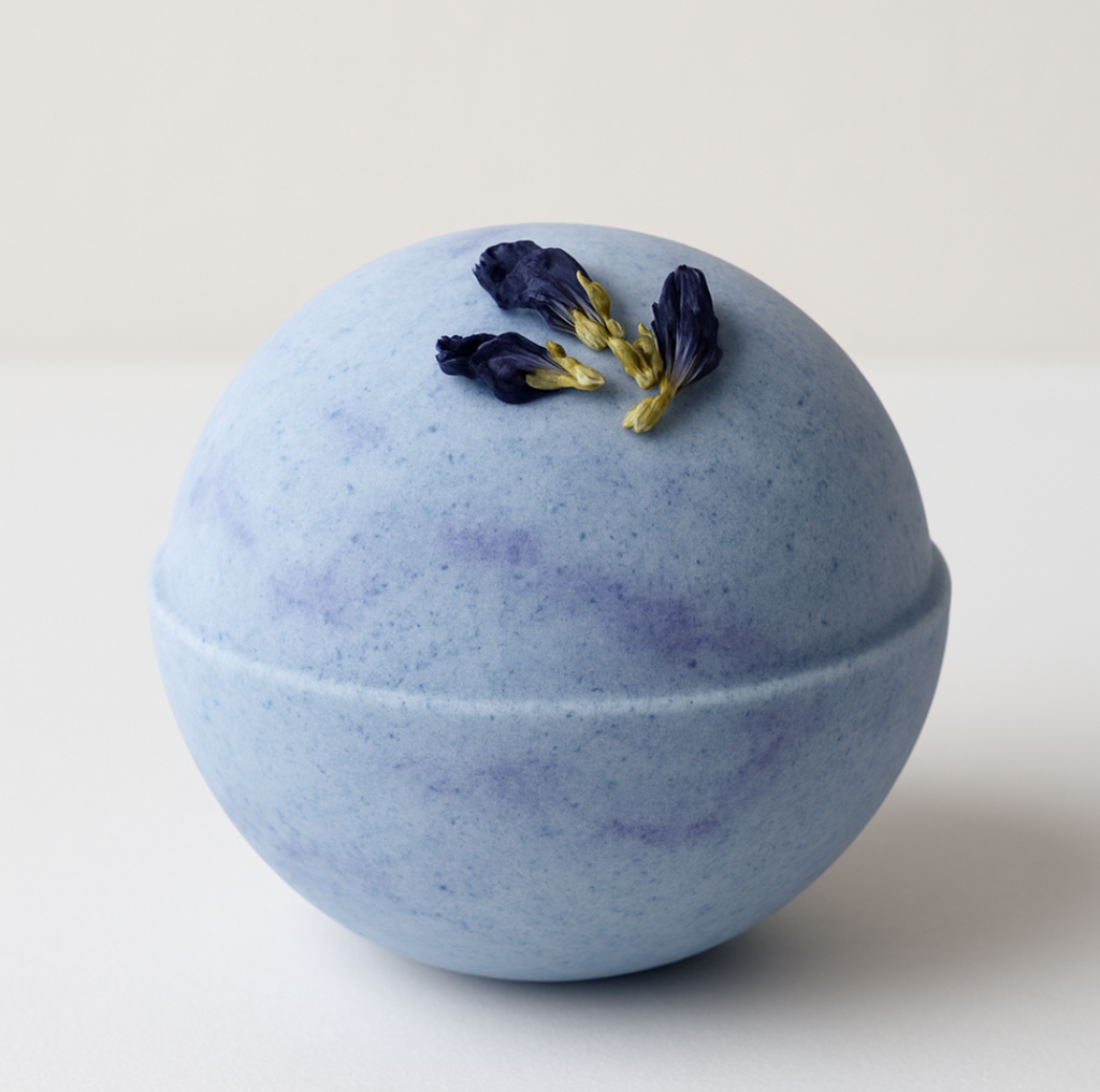 Topped with dried butterfly pea flowers and enriched with marshmallow root and coconut milk, this bomb soothes the senses and the skin — the perfect wind-down ritual for body and mind.